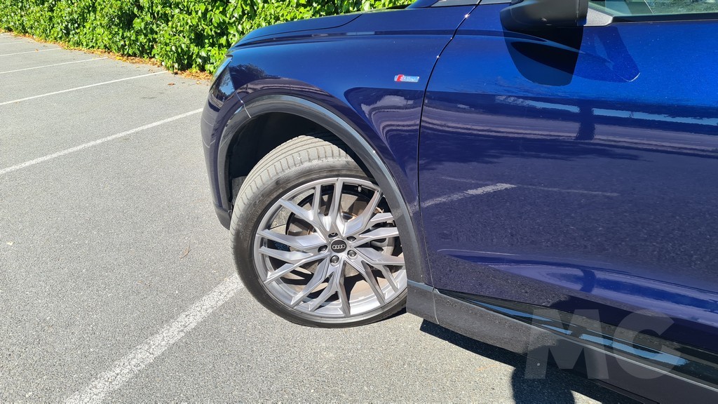 El Q4 e-tron adopta un lenguaje de diseño típicamente Audi con un estilo que se percibe en general como atractivo y discreto rozando lo deportivo en ocasiones. El frontal está dominado por la parrilla Singleframe cerrada, como se espera de un eléctrico que no necesita parrilla para refrigerar el motor, flanqueada por la inconfundible firma lumínica LED. El acabado S line eleva la apuesta estética con una apariencia más agresiva y con tintes más dinámicos. Los parachoques adoptan formas más deportivas y la parrilla recibe un acabado en negro titanio mate. El spoiler delantero al ir pintado en el color de la carrocería contribuye a reducir visualmente la altura del frontal.