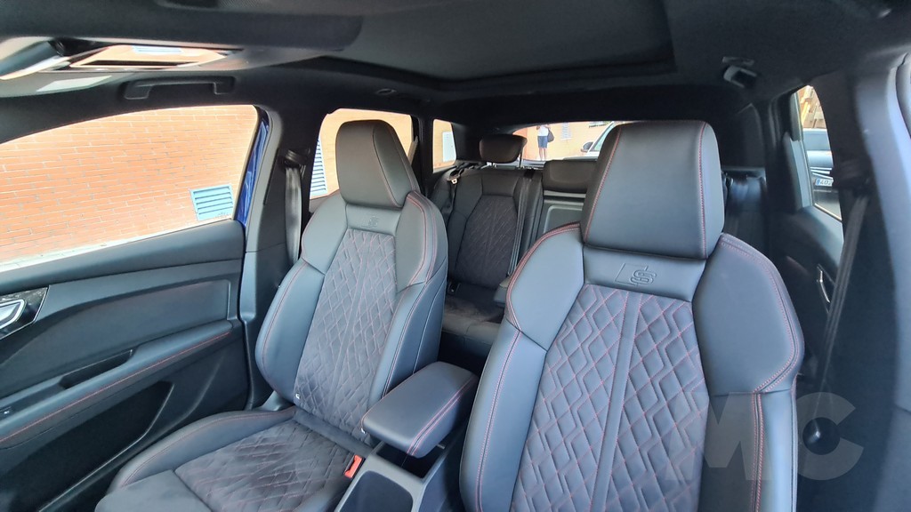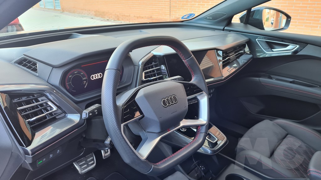 El paquete S line añade una capa de deportividad interesante y original incluyendo molduras de entrada de aluminio iluminadas con el logo «S», un revestimiento del techo en tela negra y asientos deportivos delanteros. Los asientos pueden estar tapizados en tela Index o en diversas opciones de cuero, incluyendo combinaciones como Negro con costuras Gris Roca. Estos asientos deportivos ofrecen un buen apoyo lateral manteniendo al conductor y los pasajeros bien sujetos en trayectos virados. Un punto de ergonomía crucial que diferencia al Q4 es la decisión de Audi de mantener controles físicos dedicados para el sistema de climatización y el volumen lo que permite al conductor gestionar funciones esenciales sin desviar la vista a la pantalla central.