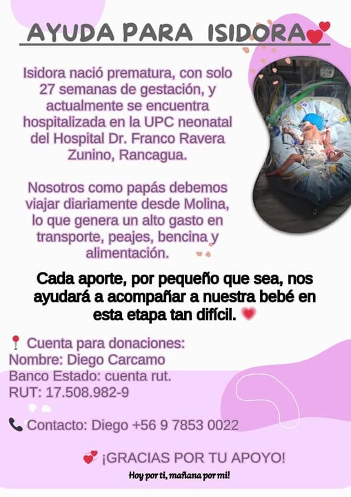«Isidora nació el 17 de octubre, a una semana de los siete meses de gestación. Tenemos que estar acá (en Rancagua) alrededor de tres meses, viajando día por medio, costeando el viaje«, señaló, agregando que ahora la lactante»se encuentra estable, pesando un kilo 100 gramos«.
