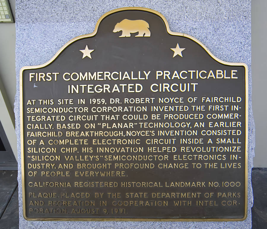 Placa conmemorativa en el edificio Fairchild donde los Ocho Traidores instalaron su taller y donde se inventó el primer circuito integrado comercialmente práctico. Imagen: Dicklyon